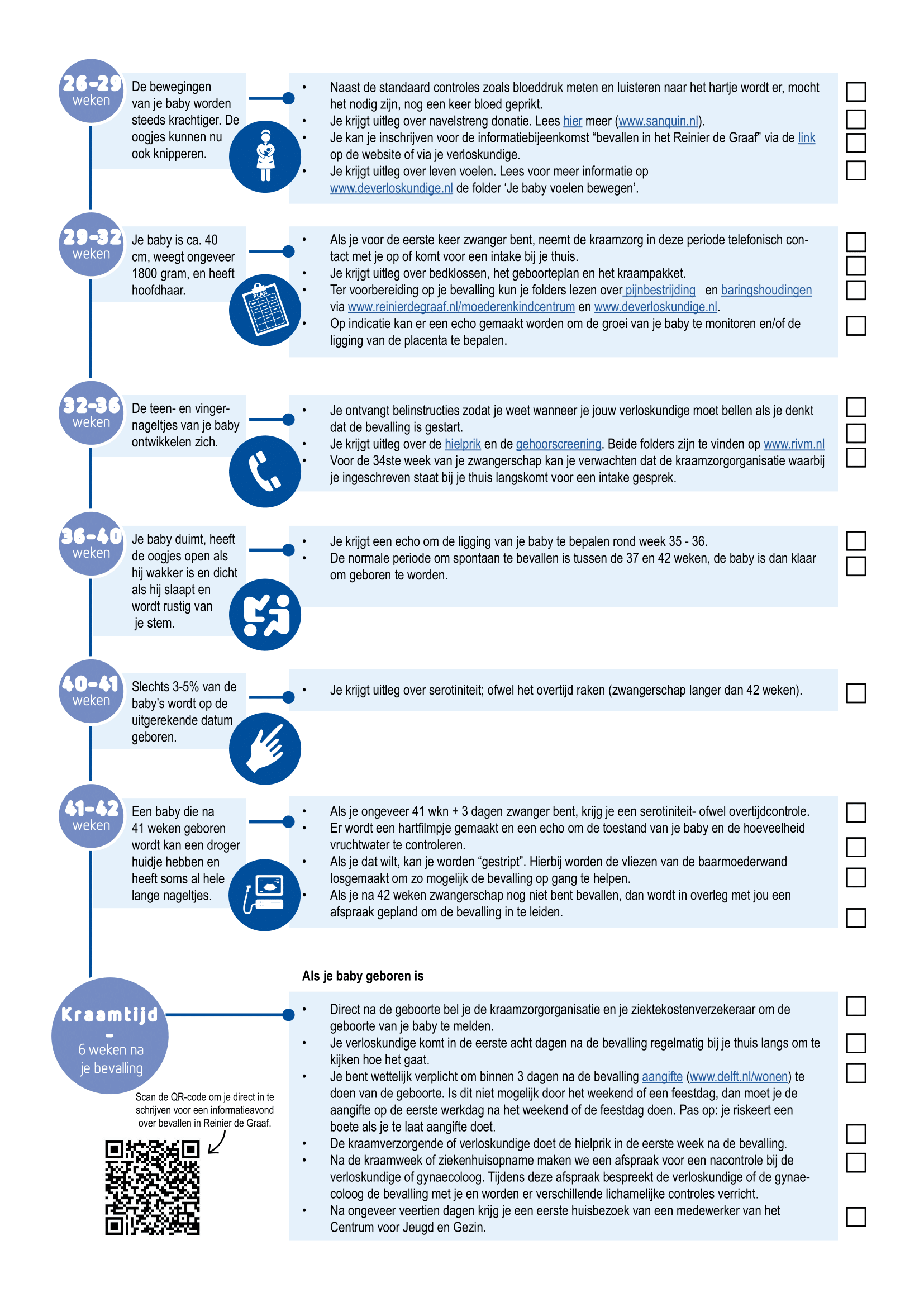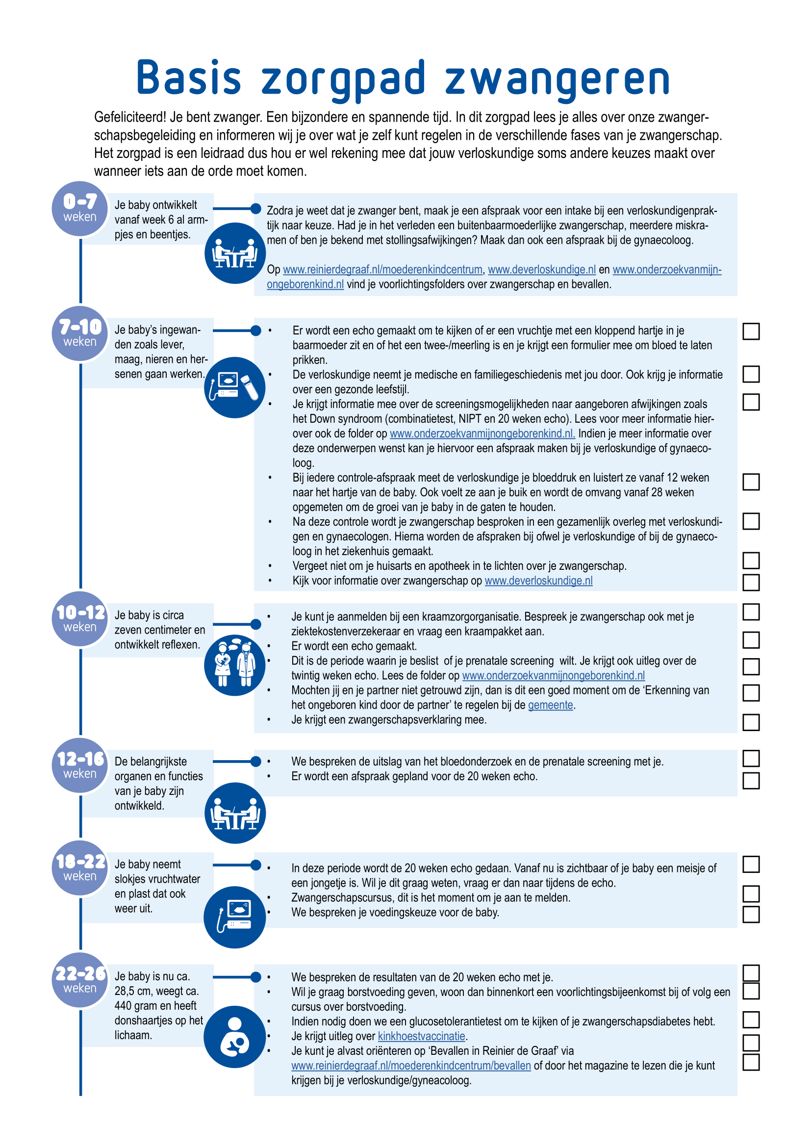 Ben je een gezonde zwangere, dan gebruiken we vaak een basis zorgpad als leidraad, zoals het zorgpad (zie onderaan deze pagina) dat is opgesteld samen met het Reinier de Graaf Ziekenhuis. Zijn er bijzondere zaken zoals ziekten bij de moeder of in de familie, of waren er bijzonderheden in eerdere zwangerschappen dan wordt dit zorgpad aangevuld met aanvullende adviezen of onderzoeken. Natuurlijk weet je vooraf nooit hoe een zwangerschap gaat verlopen, dus dit plan zal tussentijd soms aanpassingen nodig hebben, bijvoorbeeld met een extra onderzoek of echo. Maar zo weet je in grove lijn wat je de komende maanden aan begeleiding van je verloskundige kunt verwachten.